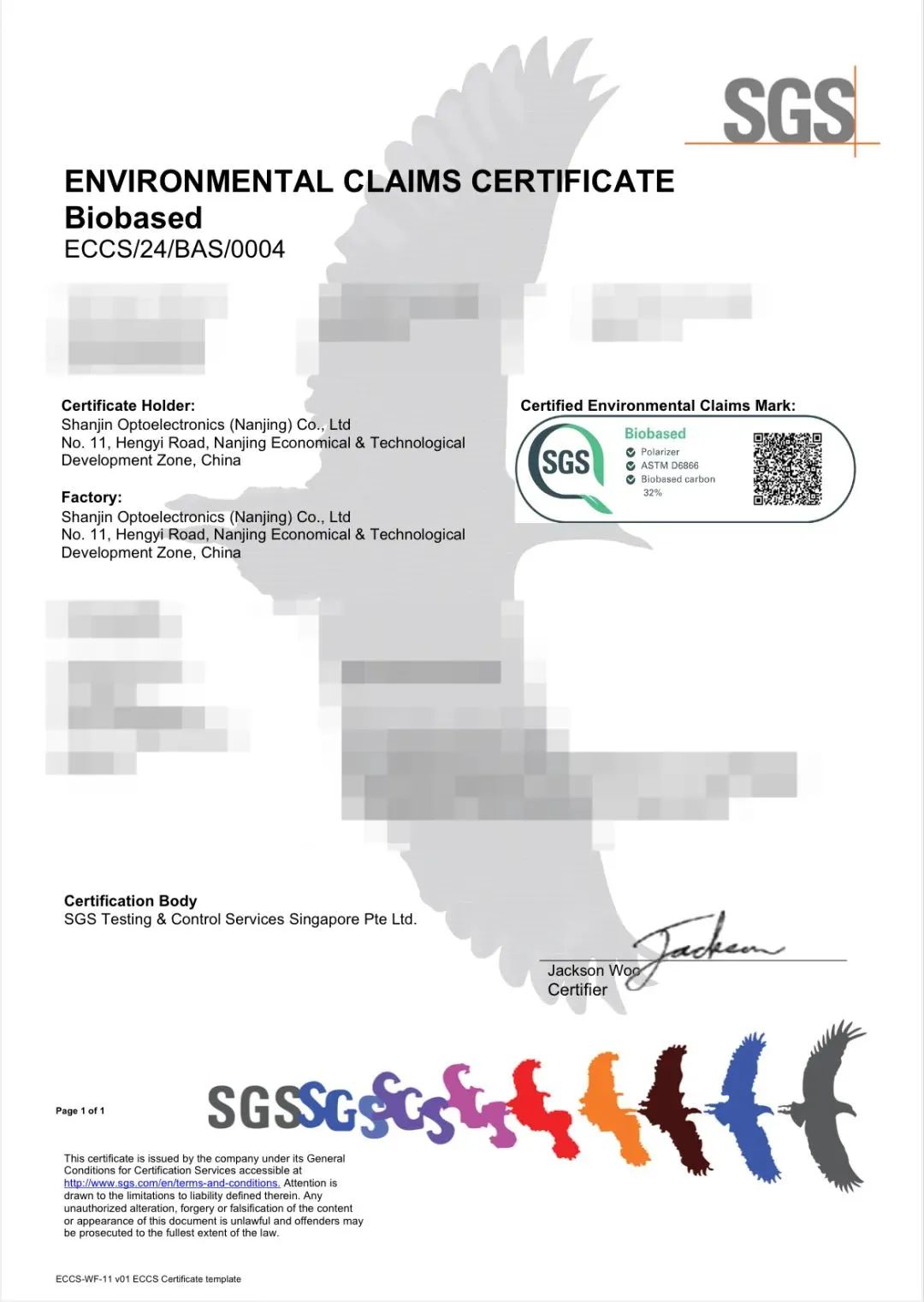 近日,杉金光電南京工廠榮獲了具有全球影響力的“SGS綠色標志”-ENVIRONMENTAL CLAIMS CERTIFICATE認證證書。這不僅標志著杉金光電在綠色制造和環保方面的卓越努力得到了國際社會的廣泛認可,更彰顯了公司踐行綠色低碳高質量發展、致力于可持續發展的堅定決心。
